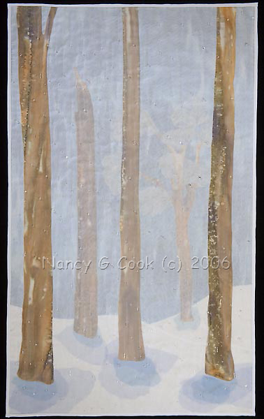 Winter veil of snow and light. Re-Visioning Fiber, Lakewood Cultural Center, Lakewood, CO SAQA Journal, Winter 2008, pg. 15 Spirituality through the Arts, UUCC, Charlotte, NC 2nd Place – Art Quilt Professional; Charlotte Quilters' Guild 2009 show Winter Whites juried exhibition, Ciel Gallery, Charlotte NC Click here for a detail image. |