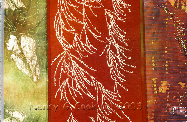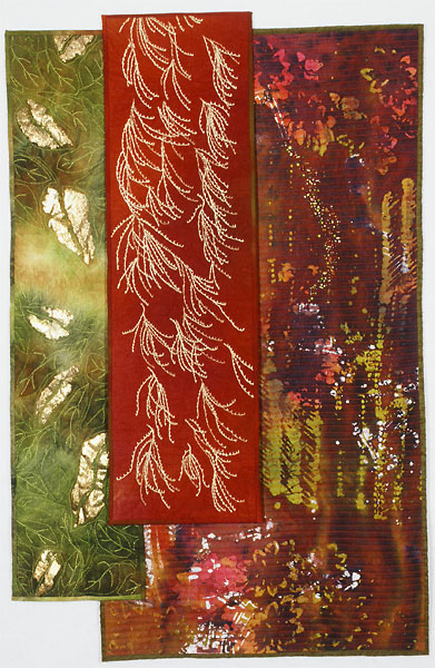 Fall comes early in Southern highlands with the Sourwood Tree’s deep crimson leaves decorated with cascading seed fronds. Art and Soul of the Quilt, Award of Excellence, Kenosha, WI International Quilt Festival Honorable Mention, Houston, TX 24th Annual Fabric of Legacies National Quilt Exhibition, Ft. Collins, CO Studio Arts Quilt Associates Portfolio 12, Pg 38 Click here for a detail image. |