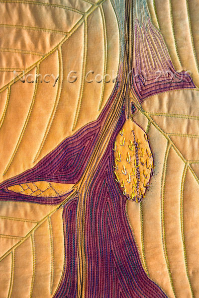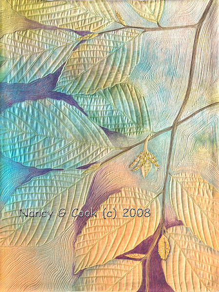 In the collection of Kenneth E. Cherry, Southern Dreams Gallery, Columbia, NC Early light on the autumn American Beech leaves in our front yard produces a wonderful play of color and line. RE-USE: Quilts Reflecting Today’s Concept of Greenness, Newark, OH Click here for a detail image. |